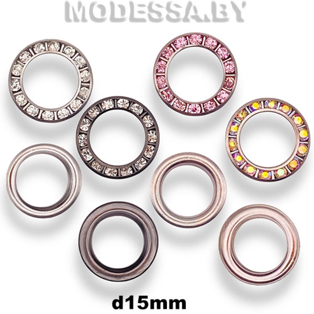 Люверсы металлические со стразами (блочки). Внутренний диаметр 15мм. Внешний диаметр 22мм. Высота ножки 5мм. Позволяют аккуратно оформить шнуровку и укрепить края отверстий для шнуровки, защитить их от трения. Подходят для поясов, а также создания шнуровки на верхней одежде, корсетах и других изделиях из плотных материалов. Установка люверса производится с помощью пресса и специальных насадок. Диаметром люверса называется внутренний диаметр отверстия в нем. Этот размер задается отверстием, которое необходимо получить.