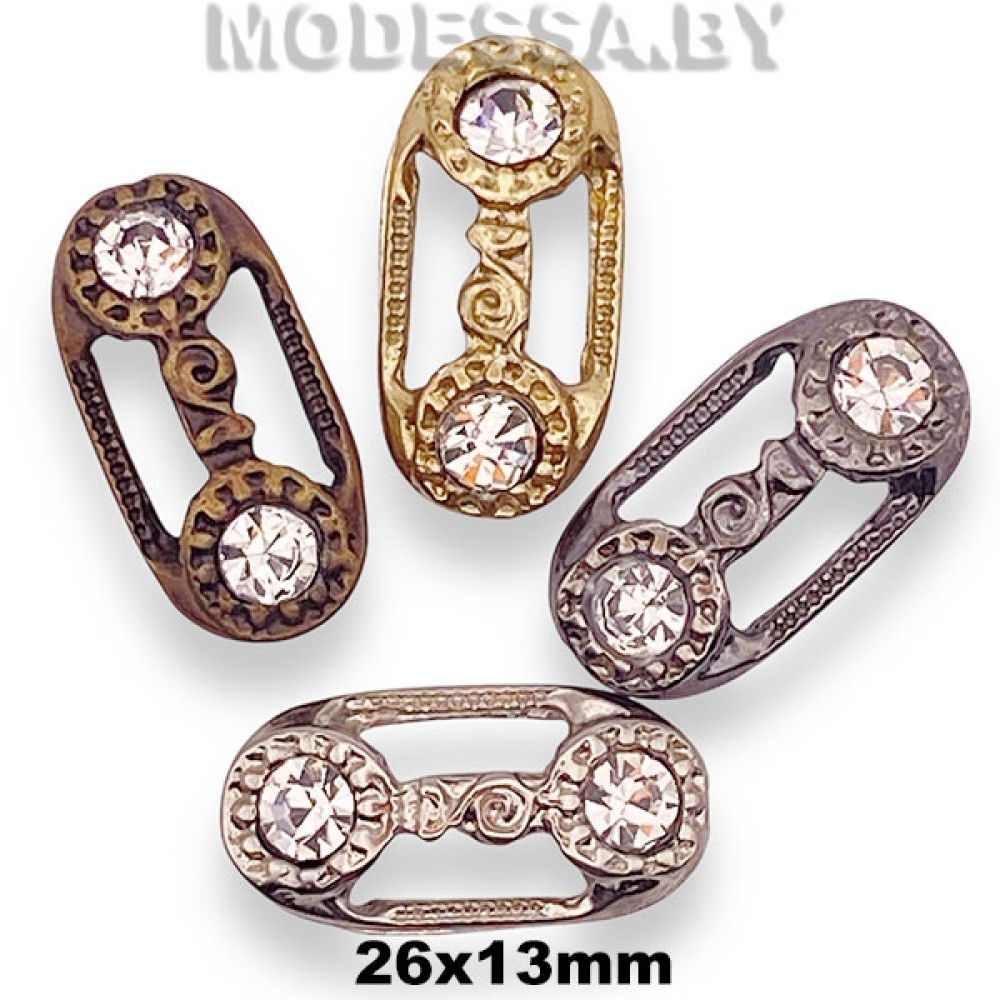 Украшение металлическое со стразами, артикул: 3042. Размер 26х13мм. Ширина отверстия для протяжки 10мм. Может применяться как декор для одежды, кожгалантерейных изделий, головных уборов, обуви, сумок и др.