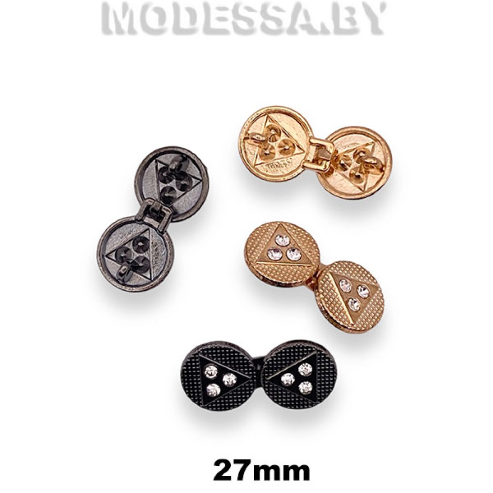 Пряжка-застёжка металлическая со стразами, артикул: 2-СЭ. Размер в застёгнутом виде 27х14мм. Застёжка состоит из двух частей, которые вставляются одна в другую. Используется как функциональный и декоративный элемент в одежде, кожгалантерейных изделиях и т. д.