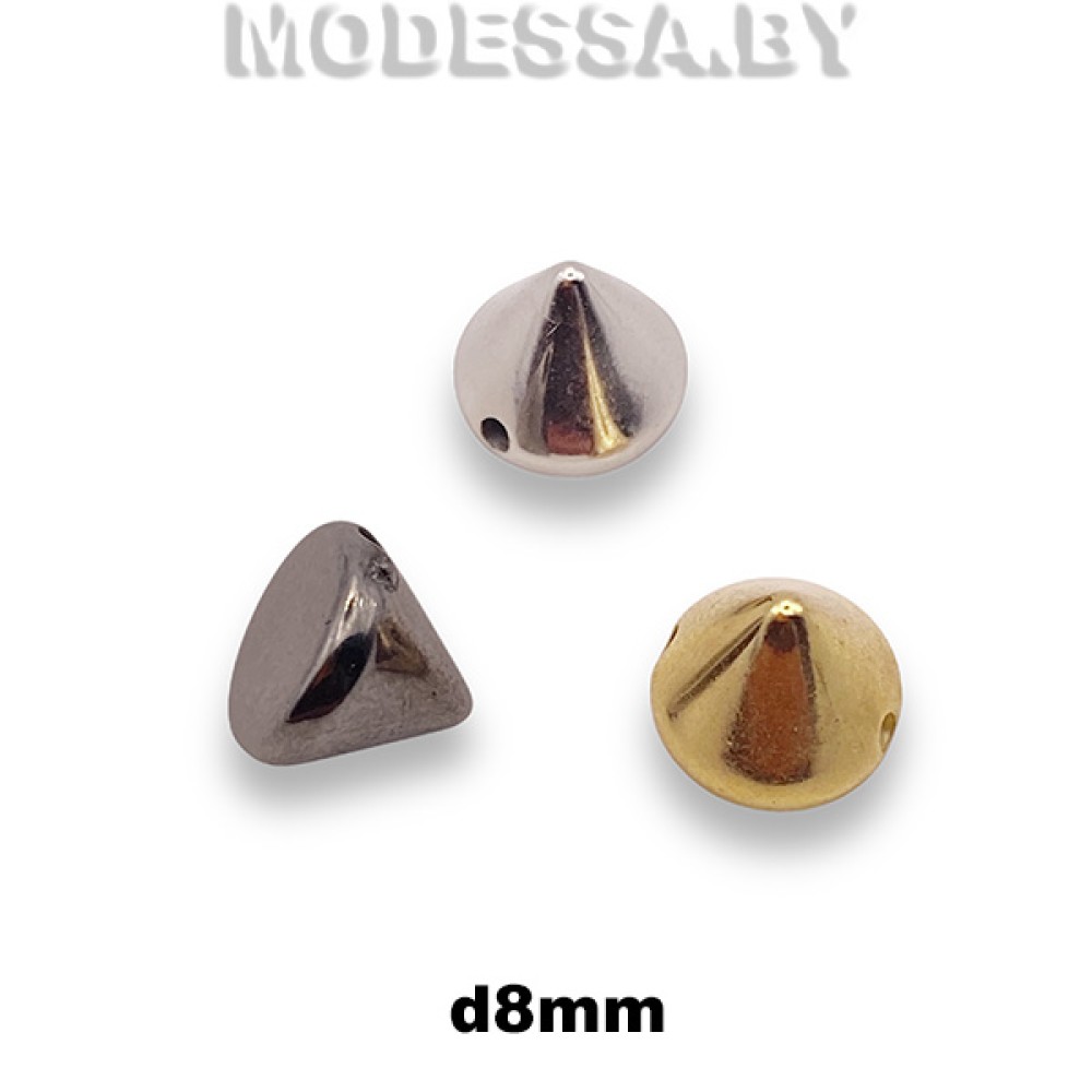 Украшение пластмассовое пришивное в форме конуса, артикул: 1404. Имеет плоское дно с двумя отверстиями. Диаметр 8мм. Высота 7мм. Используются для изготовления браслетов, декорирования одежды и аксессуаров. Шипами можно украсить практически любую вещь: кожаные куртки, бейсболки, сумки, ремни, воротнички блузок и обувь. Декорирование одежды шипами позволит создать модный, броский образ.