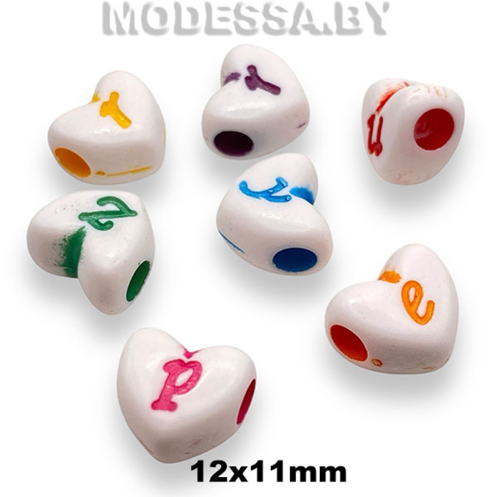 Бусина пластмассовая в форме сердца с нанесёнными английскими буквами, артикул: 489.025. Размер 12х11мм. Используется для изготовления бус, браслетов, колье и другой бижутерии, аксессуаров, для декоративного украшения одежды творческих поделок и др.