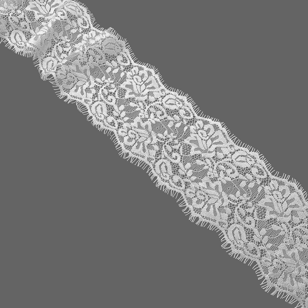 Кружево синтетическое с «ресничками», артикул: 205-11 А. Ширина 100мм, длина 1 ленты — 3м. Кружево очень нежное, тонкое, воздушное, но в то же время прочное. Тянется лишь слегка за счёт переплетения нитей. Чаще всего применяется для украшения нижнего белья, отделки ночных рубашек, сорочек, также можно декорировать низ платьев, рукава и др.