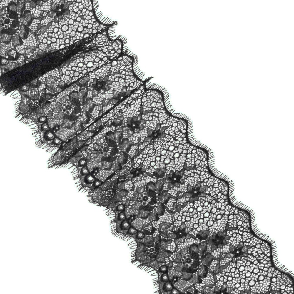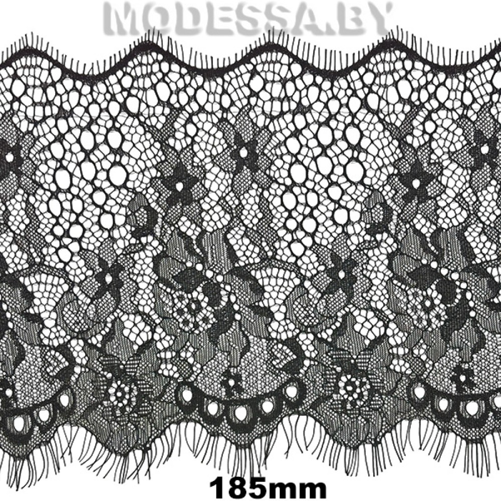 Кружево синтетическое с «ресничками», артикул: А 399. Ширина 185мм, длина 1 ленты — 3м. Кружево очень нежное, тонкое, воздушное, но в то же время прочное. Тянется лишь слегка за счёт переплетения нитей. Чаще всего применяется для украшения нижнего белья, отделки ночных рубашек, сорочек, также можно декорировать низ платьев, рукава и др.