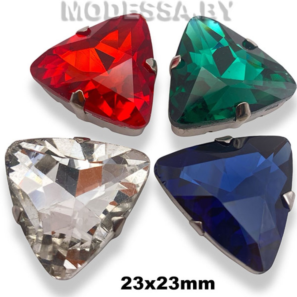 Стразы стеклянные в металлической оправе треугольной формы, артикул: 2233. Размер 23х23мм. Пришивные стразы из стекла прекрасно подойдут для декора одежды и аксессуаров. Благодаря своей яркости и блеску, они добавят изделиям изысканности и элегантности. Крепятся к изделию путём пришивания металлической цапы, в которую вставлена страза.