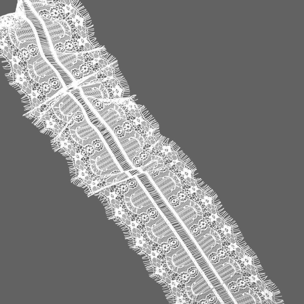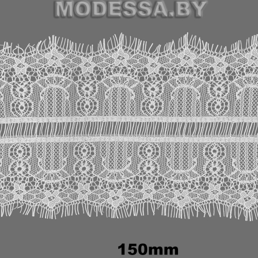 Кружево синтетическое с «ресничками», артикул: 751 А. Ширина 150мм, длина 1 ленты — 3м. Кружево очень нежное, тонкое, воздушное, но в то же время прочное. Тянется лишь слегка за счёт переплетения нитей. Чаще всего применяется для украшения нижнего белья, отделки ночных рубашек, сорочек, также можно декорировать низ платьев, рукава и др.
