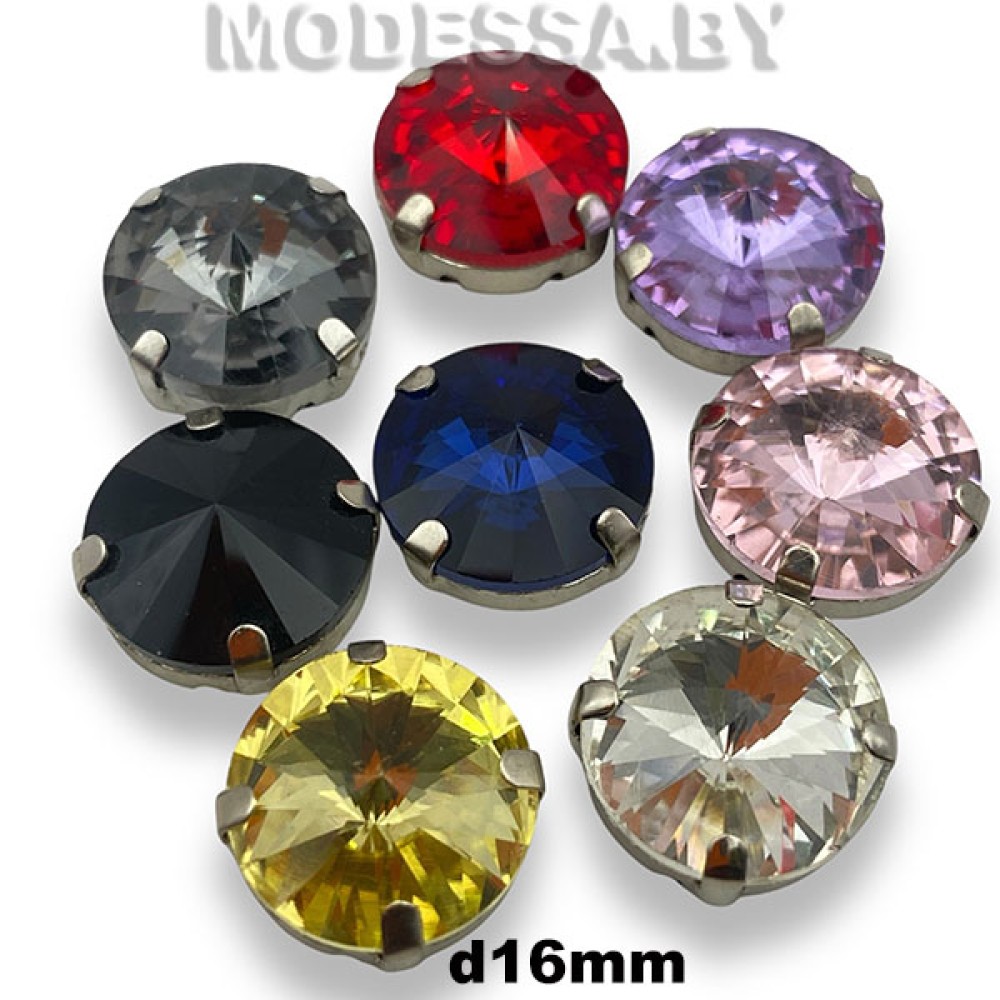 Стразы стеклянные в металлической оправе круглой формы, артикул: 16. Диаметр 16мм. Пришивные стразы из стекла прекрасно подойдут для декора одежды и аксессуаров. Благодаря своей яркости и блеску, они добавят изделиям изысканности и элегантности. Крепятся к изделию путём пришивания металлической цапы, в которую вставлена страза.