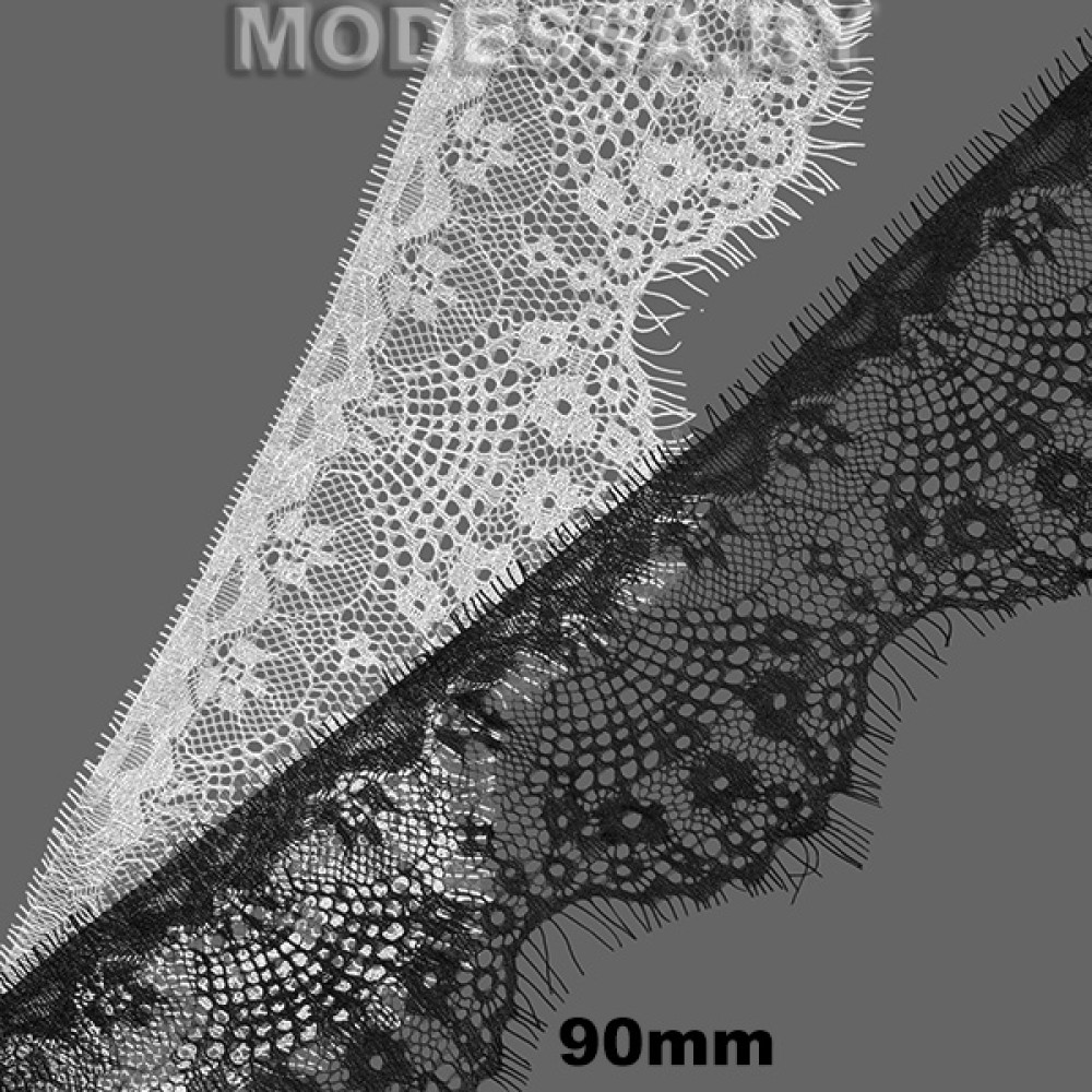 Кружево синтетическое с «ресничками», артикул: А 019 С-1. Ширина 90мм, длина 1 ленты — 3м. Кружево очень нежное, тонкое, воздушное, но в то же время прочное. Тянется лишь слегка за счёт переплетения нитей. Чаще всего применяется для украшения нижнего белья, отделки ночных рубашек, сорочек, также можно декорировать низ платьев, рукава и др.