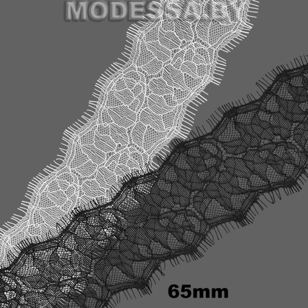 Кружево синтетическое с «ресничками», артикул: А 010. Ширина 65мм, длина 1 ленты — 3м. Кружево очень нежное, тонкое, воздушное, но в то же время прочное. Тянется лишь слегка за счёт переплетения нитей. Чаще всего применяется для украшения нижнего белья, отделки ночных рубашек, сорочек, также можно декорировать низ платьев, рукава и др.