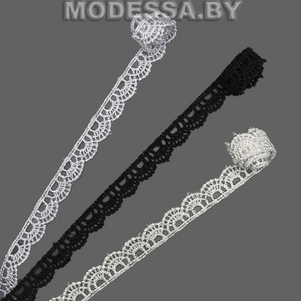 Кружево синтетическое гипюр, артикул: 304 W. Ширина 12мм. Благодаря жесткости, гипюр хорошо держит форму. Применяется при пошиве одежды, белья и домашнего текстиля, а также используют для декора других материалов.