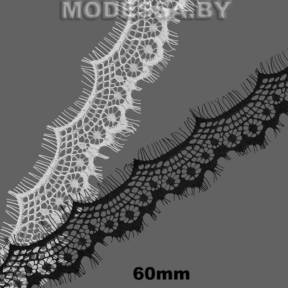 Кружево синтетическое с «ресничками», артикул: А 166. Ширина 60мм, длина 1 ленты — 3м. Кружево очень нежное, тонкое, воздушное, но в то же время прочное. Тянется лишь слегка за счёт переплетения нитей. Чаще всего применяется для украшения нижнего белья, отделки ночных рубашек, сорочек, также можно декорировать низ платьев, рукава и др.