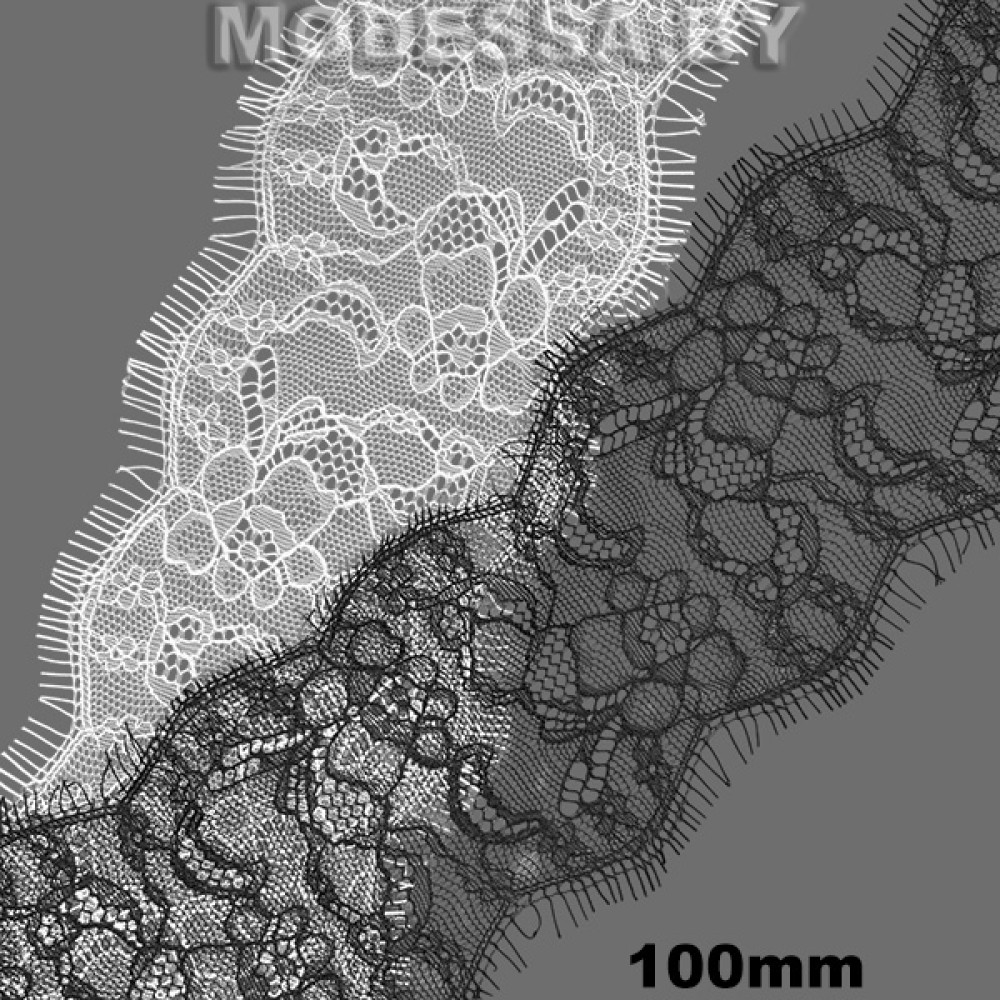 Кружево синтетическое с «ресничками», артикул: А 685. Ширина 100мм, длина 1 ленты — 3м. Кружево очень нежное, тонкое, воздушное, но в то же время прочное. Тянется лишь слегка за счёт переплетения нитей. Чаще всего применяется для украшения нижнего белья, отделки ночных рубашек, сорочек, также можно декорировать низ платьев, рукава и др.