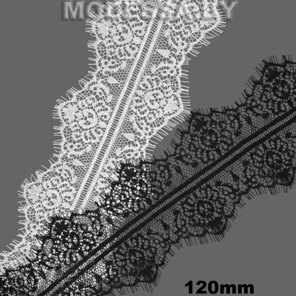 Кружево синтетическое с «ресничками», артикул: А 782. Ширина 120мм, длина 1 ленты — 3м. Кружево очень нежное, тонкое, воздушное, но в то же время прочное. Тянется лишь слегка за счёт переплетения нитей. Чаще всего применяется для украшения нижнего белья, отделки ночных рубашек, сорочек, также можно декорировать низ платьев, рукава и др.