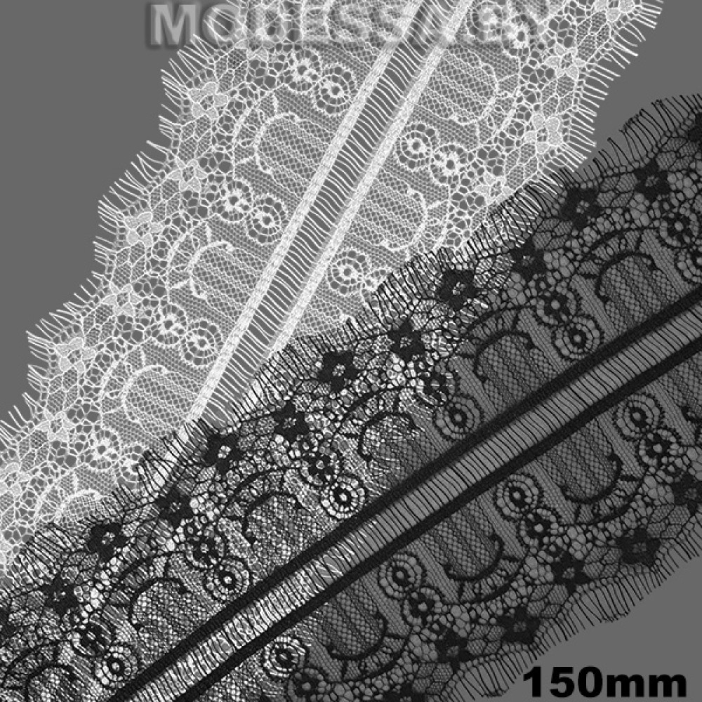 Кружево синтетическое с «ресничками», артикул: 751 А. Ширина 150мм, длина 1 ленты — 3м. Кружево очень нежное, тонкое, воздушное, но в то же время прочное. Тянется лишь слегка за счёт переплетения нитей. Чаще всего применяется для украшения нижнего белья, отделки ночных рубашек, сорочек, также можно декорировать низ платьев, рукава и др.