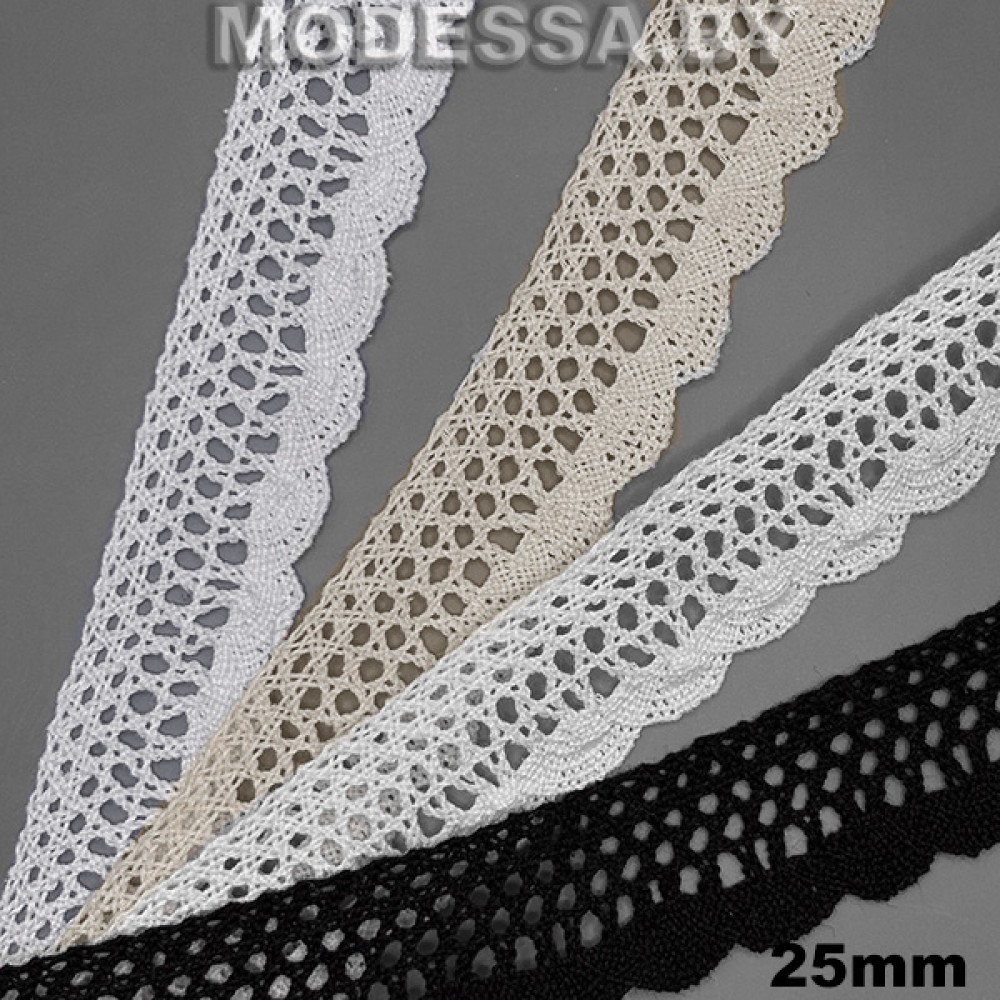 Кружево хлопковое, артикул: A-6554. Ширина 25мм. Применяется при пошиве одежды, белья и домашнего текстиля, а также используют для декора других материалов.