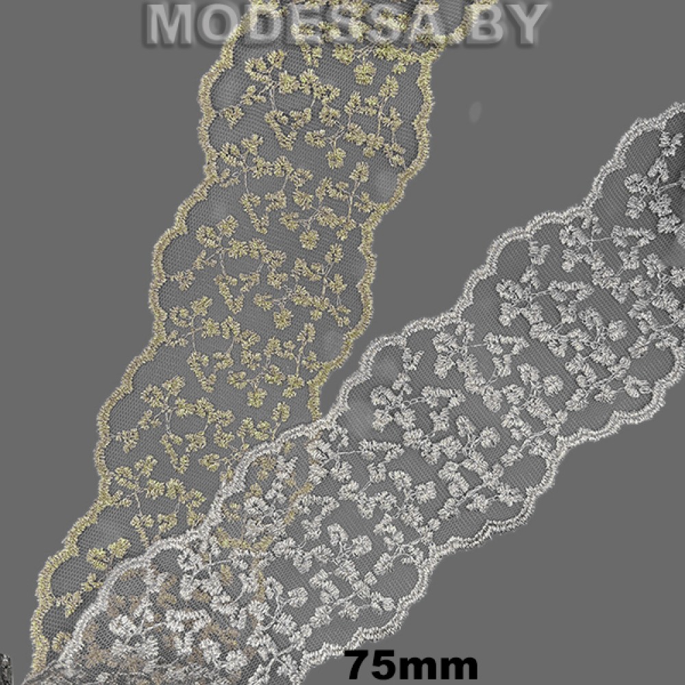Вышивка на сетке с люрексом, артикул: 41266.17. Ширина 75мм. Применяется в пошиве нижнего белья, свадебных и вечерних платьев, а также для декора одежды, домашнего текстиля и др.