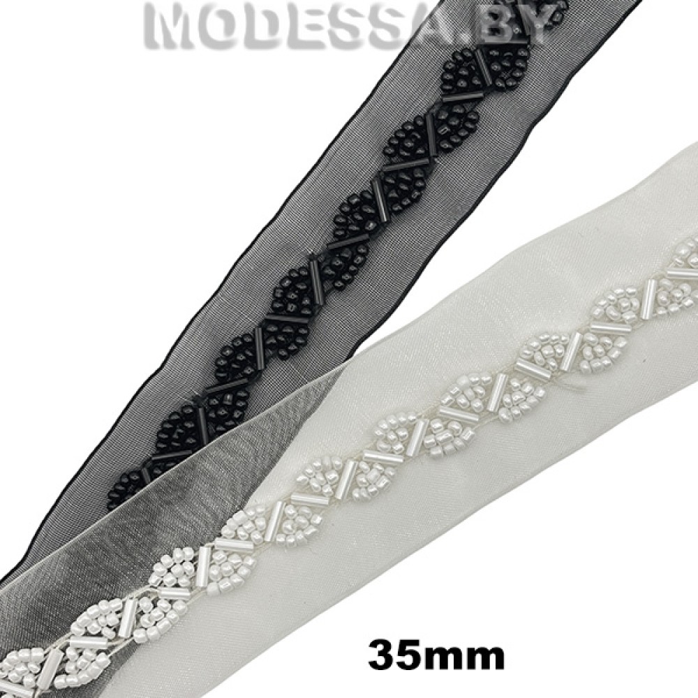 Тесьма декоративная вышитая бисером и стеклярусом на органзе, артикул: 0575 IUS. Ширина 35мм. Используется для декоративной отделки одежды, аксессуаров и др.