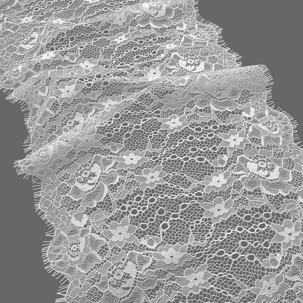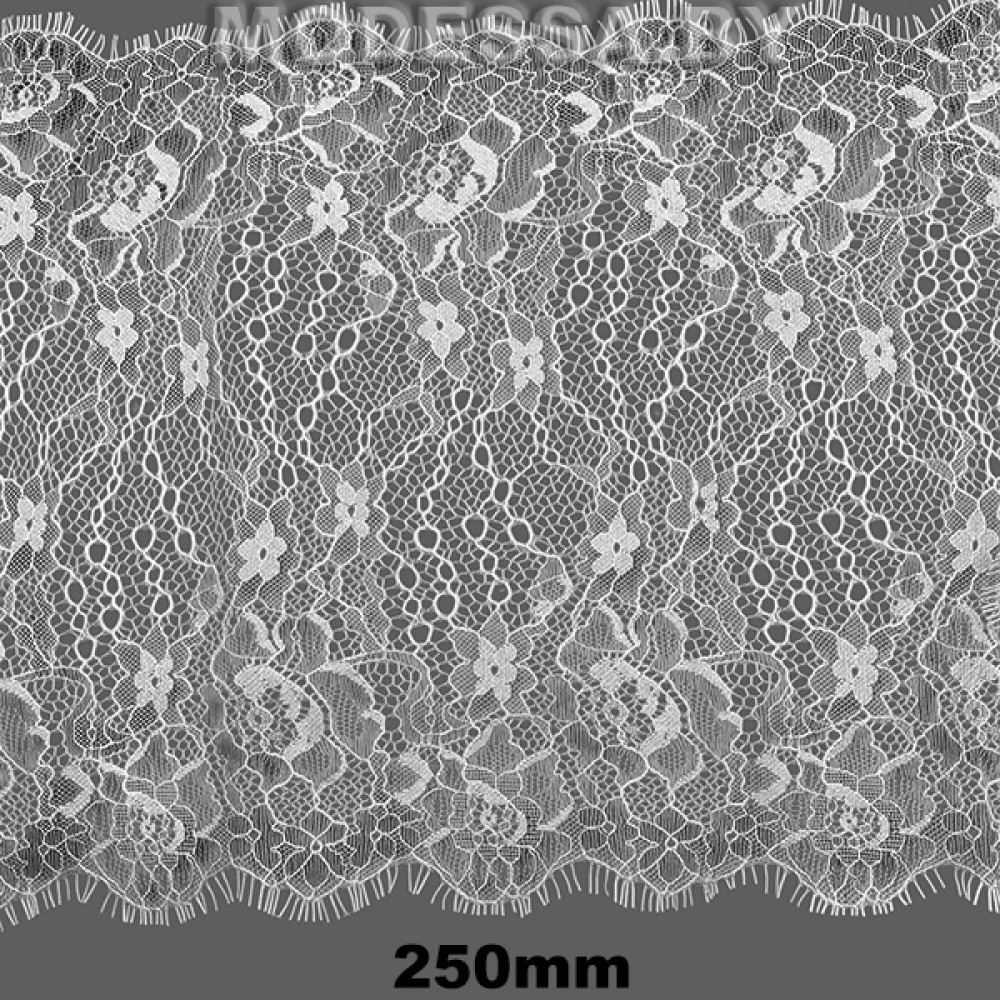 Кружево синтетическое с «ресничками», артикул: 8821. Ширина 250мм, длина 1 ленты — 3м. Кружево очень нежное, тонкое, воздушное, но в то же время прочное. Тянется лишь слегка за счёт переплетения нитей. Чаще всего применяется для украшения нижнего белья, отделки ночных рубашек, сорочек, также можно декорировать низ платьев, рукава и др.