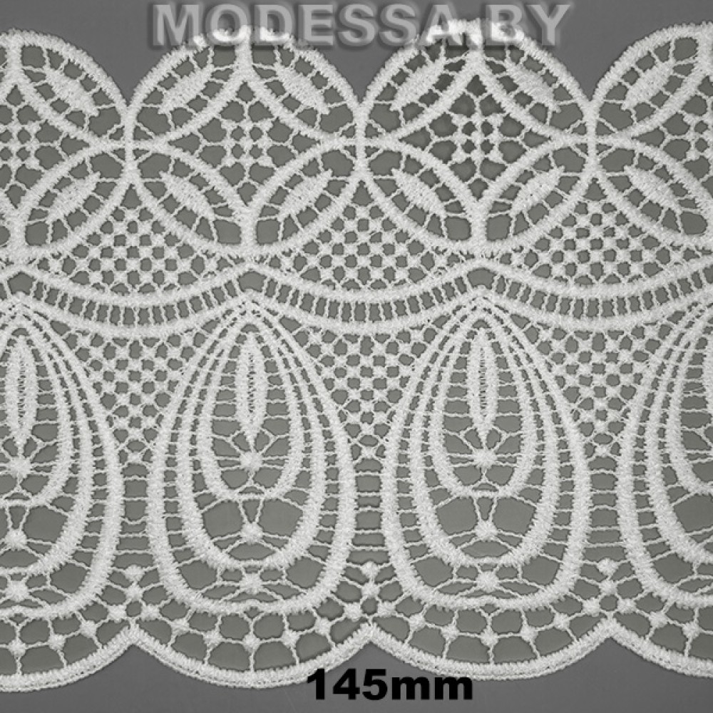 Кружево синтетическое гипюр, артикул: 41757.26. Ширина 145мм. Благодаря жесткости, гипюр хорошо держит форму. Применяется при пошиве одежды, белья и домашнего текстиля, а также используют для декора других материалов.