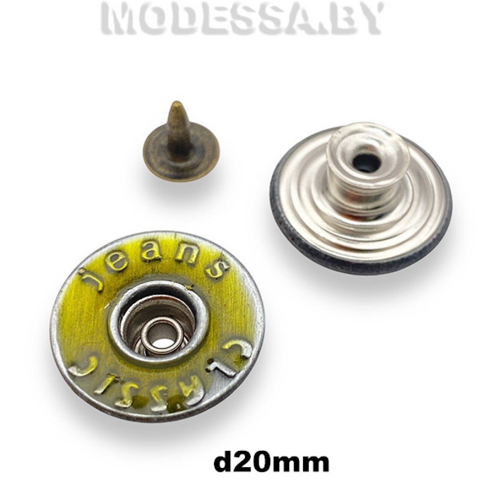 Заклёпка-пуговица металлическая, на плавающей ножке, артикул: 01725. Диаметр 20мм. Джинсовые пуговицы используются при изготовлении одежды и других изделий из джинсовой ткани. Данная пуговица будет эффектно смотреться как на одежде, так и на рюкзаке, сумке.