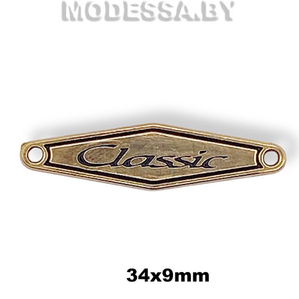 Бирка металлическая «Classik», артикул: 02012 SH. Размер 34х9мм. С помощью бирки можно добавить уникальности изделию или украсить вещь, будь то одежда, обувь, сумка или рюкзак. Легко пришивается с помощью отверстий к любому предмету одежды и делают его более привлекательным и стильным.