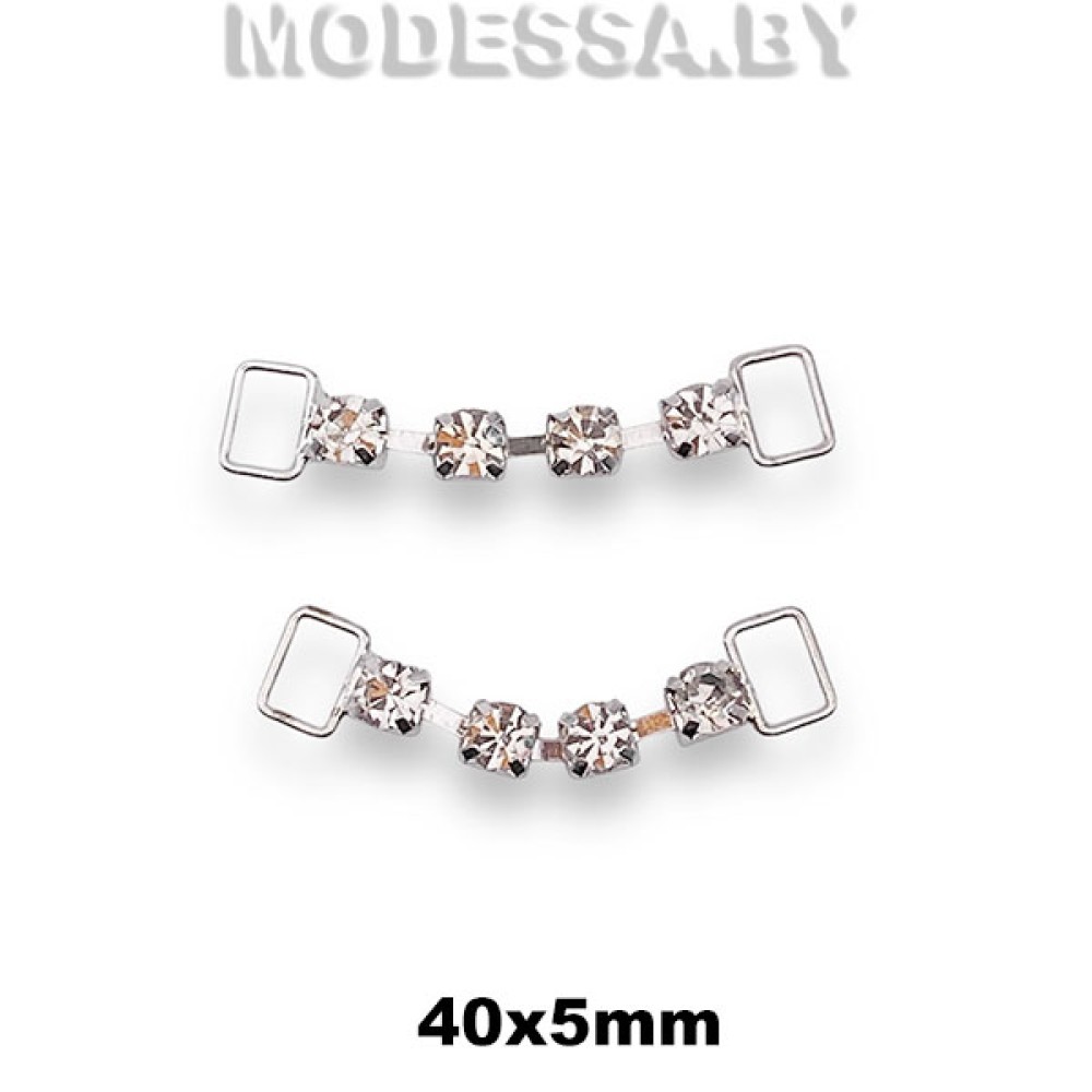 Пришивное украшение металлическое со стразами, артикул: 1 SJ. Размер 40х5мм. Ширина отверстия для протяжки 5мм. Модель украшения идеально подходит для декорирования горловины блузок, рубашек или платьев, а также для декоративного оформления сумок, аксессуаров и др.