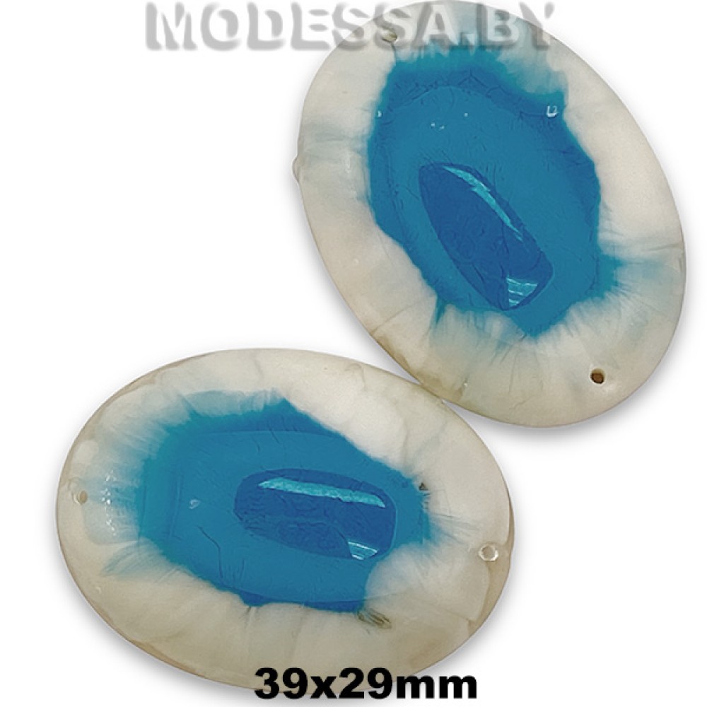 Украшение пластмассовое овальной формы, артикул: 10075 АС. Размер 39х29мм. Украшение с двумя отверстиями и плоским дном используется для украшения одежды, обуви, сумок, для декорирования предметов интерьера и др.