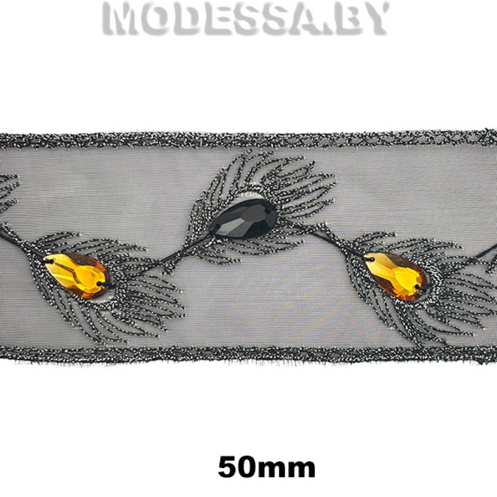 Тесьма декоративная с пластиковыми украшениями и люрексом на органзе, артикул: 1210. Ширина 50мм. Используется для декоративной отделки одежды и аксессуаров.