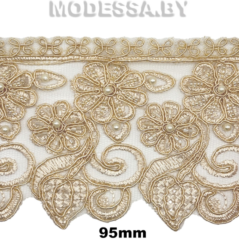Вышивка на сетке с бусинами, артикул: 1262 XDH. Ширина 95мм. Применяется в пошиве нижнего белья, свадебных и вечерних платьев, а также для декора одежды, домашнего текстиля и др.