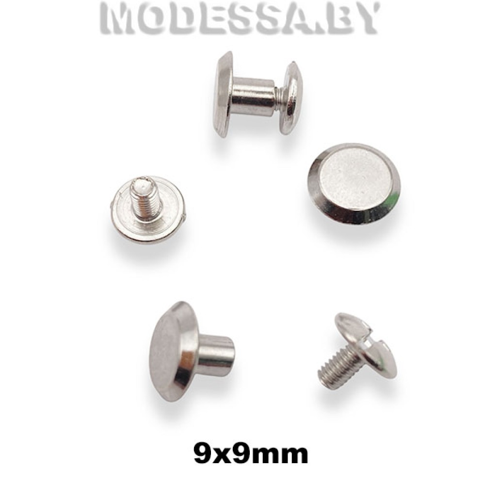 Винт для ремней и сумок металлический, артикул: 1356 C. Диаметр шляпки 9мм, высота ножки 5мм, диаметр шляпки винта 8мм. Винты используются в качестве застёжек для браслетов, замков на мужских сумках, ремней. Позволяют плотно и надежно соединять элементы. Также может применяться и в качестве декоративного элемента в одежде, обуви и аксессуарах.