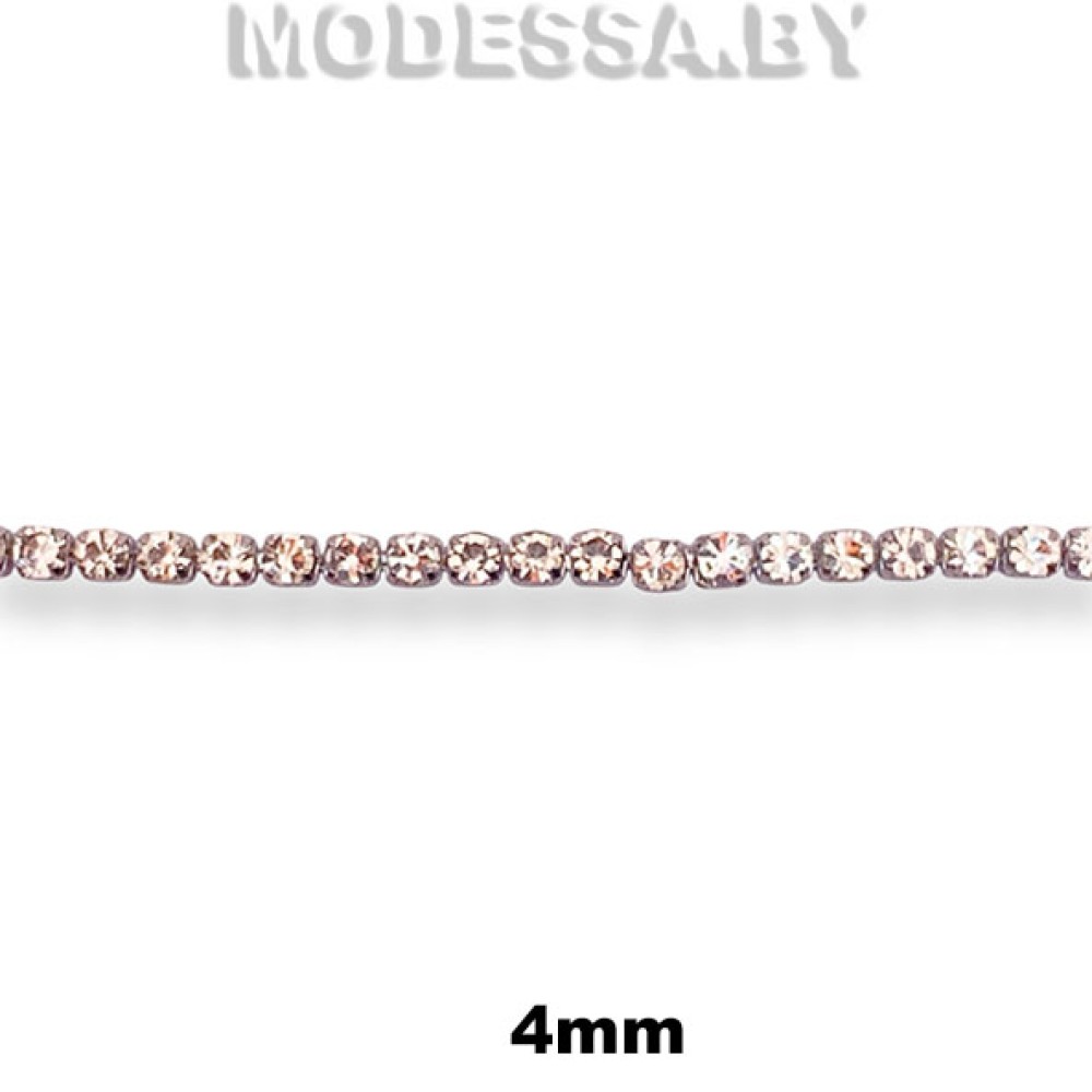 Цепочка из страз стеклянных в металлической оправе, артикул: 16 SS. Ширина 4мм. Состоит из последовательно закрепленных страз в цапах, которые скреплены между собой подвижной металлической пластинкой. Стразовая цепочка применяется для создания уникальных женских украшений, браслетов, колье, сережек, чокеров; декорирования клатчей, сумочек, головных уборов, обуви и др.