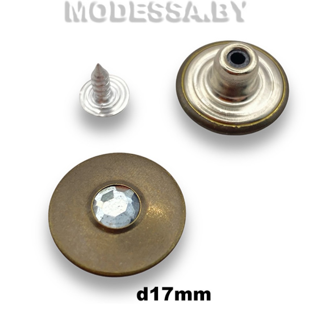 Заклёпка-пуговица металлическая со стразами, на фиксированной ножке, артикул: 1701609. Диаметр 17мм. Джинсовые пуговицы используются при изготовлении одежды и других изделий из джинсовой ткани. Данная пуговица будет эффектно смотреться как на одежде, так и на рюкзаке, сумке.