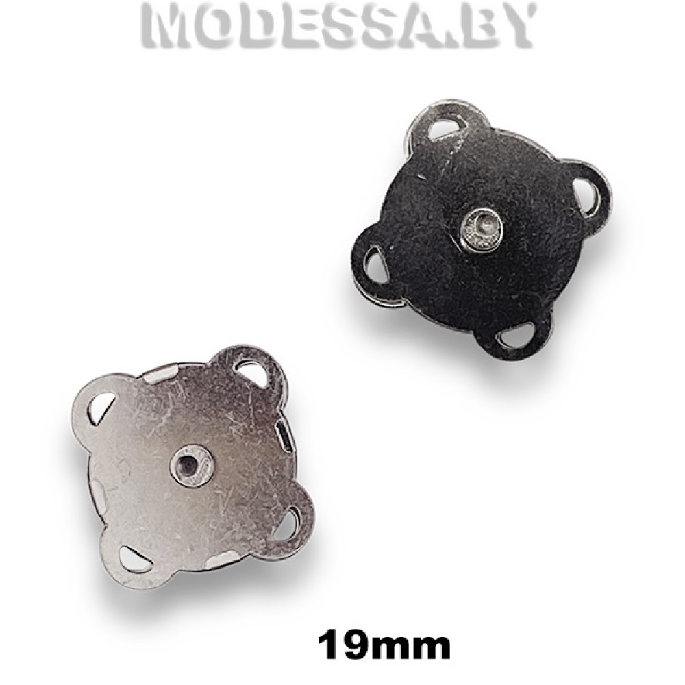 Кнопка металлическая магнитная пришивная, артикул: 2026. Диаметр 19мм. Пришивная магнитная кнопка с ушками по углам применяется в качестве застежки в сумках, верхней и специализированной одежде, вязанных изделиях.