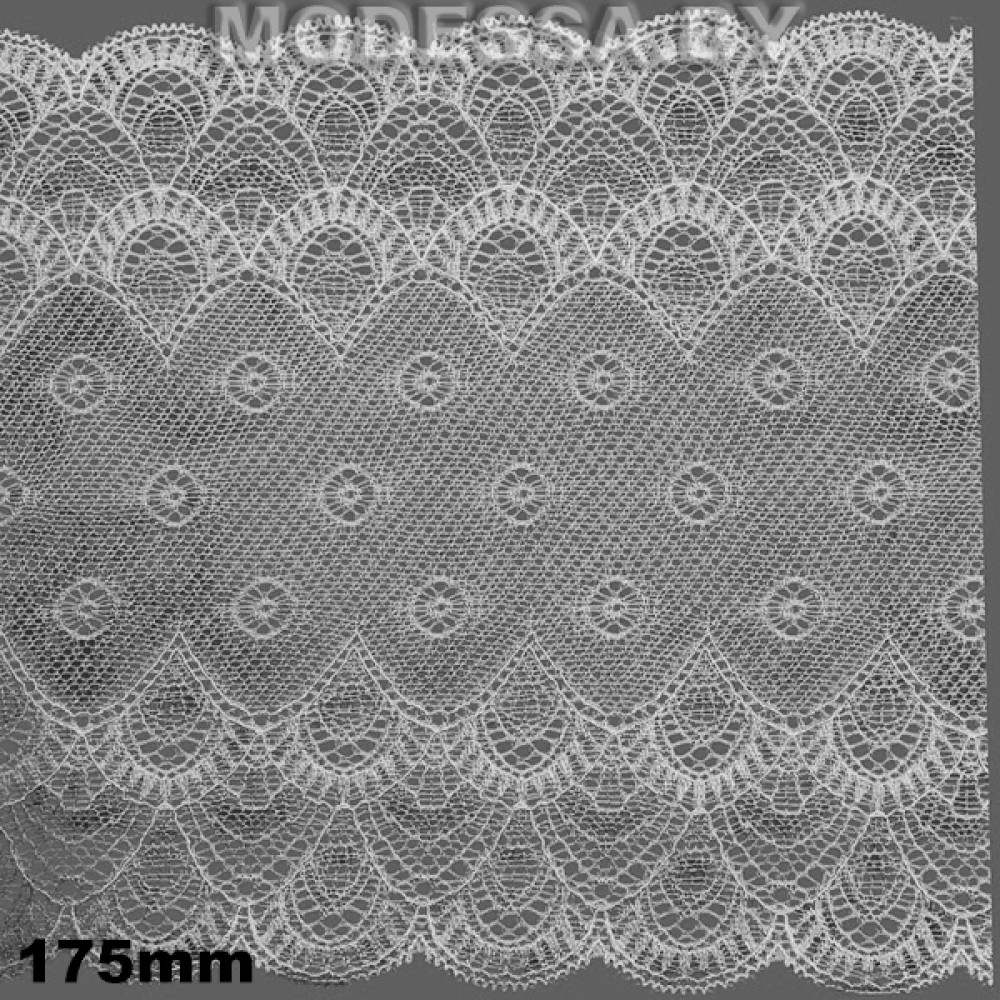 | 1 Тип товараКружево синтетическое стрейчевое | 3 ЦветБелый | 2 Ширина, мм175 |
