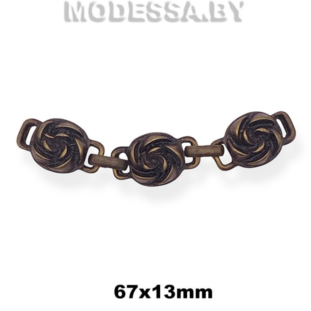 Пришивное украшение металлическое, артикул: 1322. Размер 67х13мм. Ширина отверстия для протяжки 5мм. Модель украшения идеально подходит для декорирования горловины блузок, рубашек или платьев, а также для декоративного оформления сумок, аксессуаров и др.