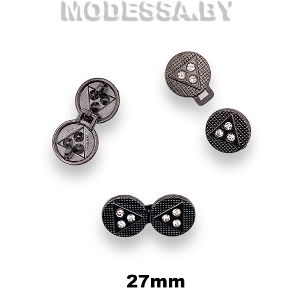 Пряжка-застёжка металлическая со стразами, артикул: 2-СЭ. Размер в застёгнутом виде 27х14мм. Застёжка состоит из двух частей, которые вставляются одна в другую. Используется как функциональный и декоративный элемент в одежде, кожгалантерейных изделиях и т. д.