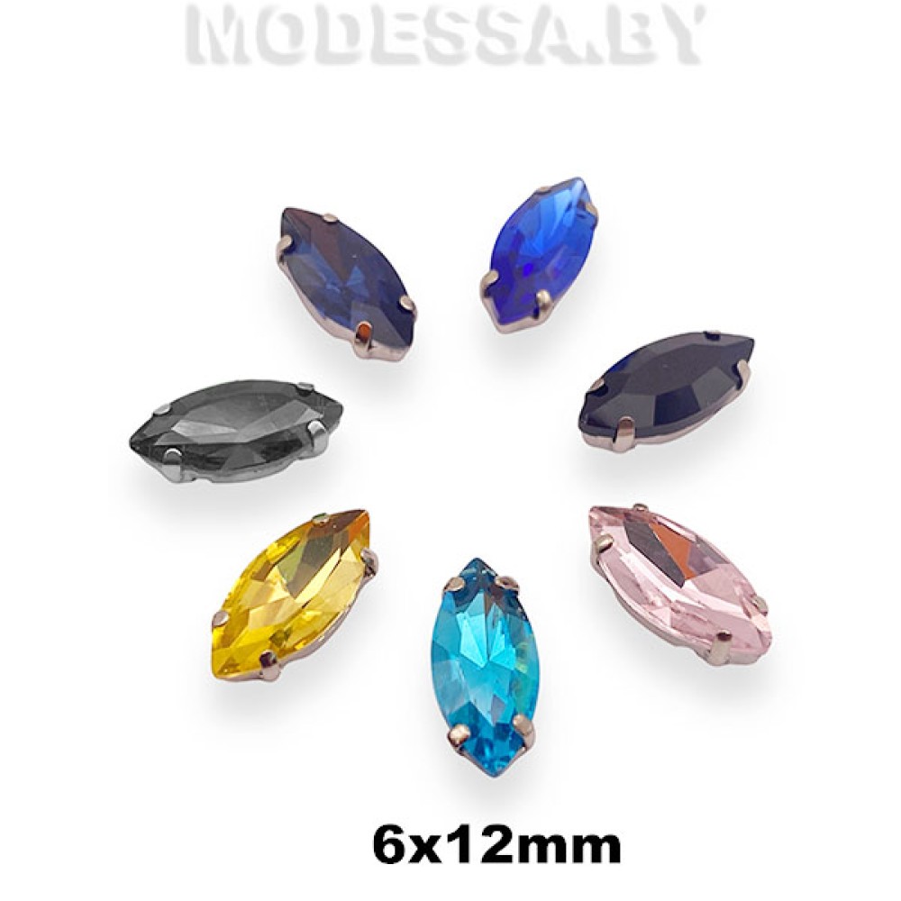 Стразы стеклянные в металлической оправе, артикул: 2051. Размер 6х12мм. Пришивные стразы из стекла прекрасно подойдут для декора одежды и аксессуаров. Благодаря своей яркости и блеску, они добавят изделиям изысканности и элегантности. Крепятся к изделию путём пришивания металлической цапы, в которую вставлена страза.