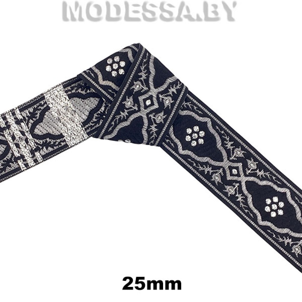 Жаккардовая лента с люрексом — это тип декоративной ленты, известной своими детализированными тканными узорами, созданными с помощью жаккардовой техники ткачества. Плотная лента используется для декоративной отделки одежды, аксессуаров и др. Арткул: 2310. Ширина 25мм.