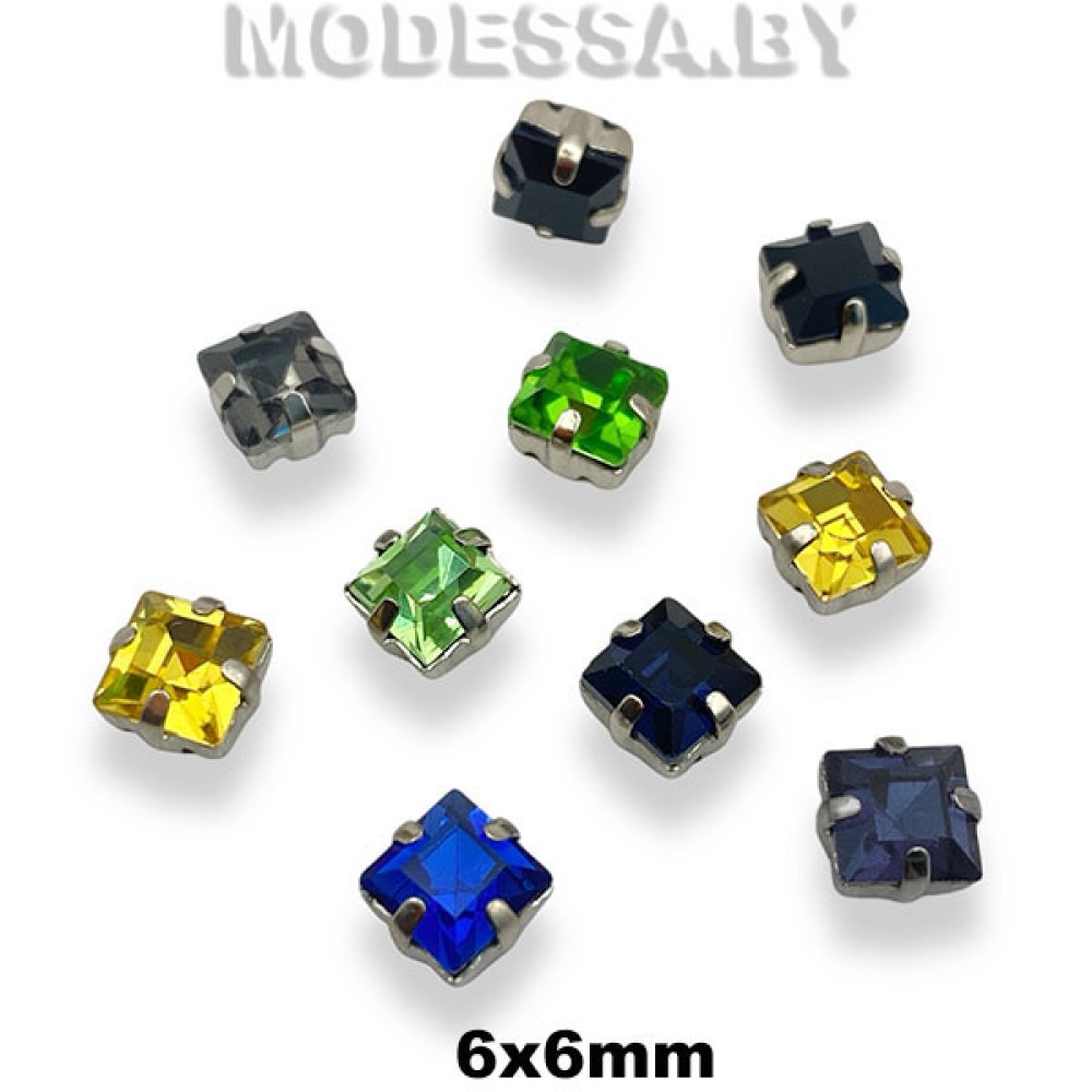 Стразы стеклянные в металлической оправе квадратной формы, артикул: 2641. Размер 6х6мм. Пришивные стразы из стекла прекрасно подойдут для декора одежды и аксессуаров. Благодаря своей яркости и блеску, они добавят изделиям изысканности и элегантности. Крепятся к изделию путём пришивания металлической цапы, в которую вставлена страза.