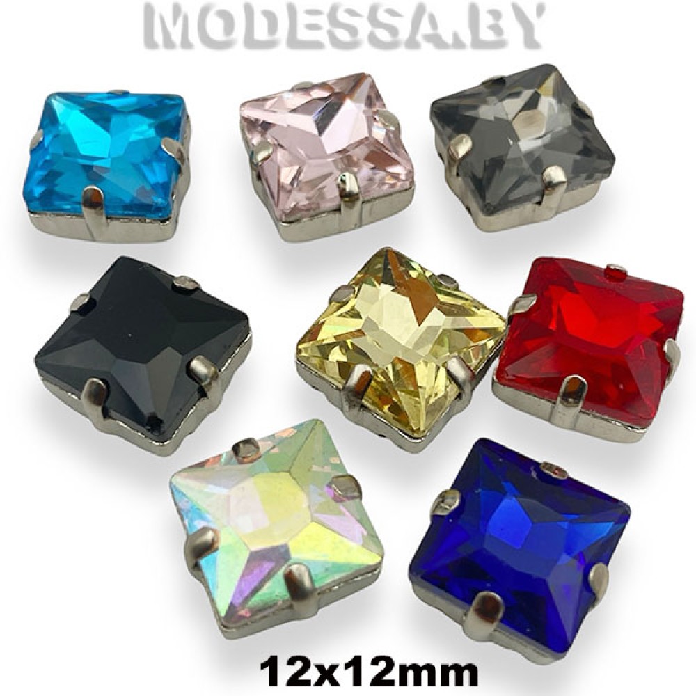 Стразы стеклянные в металлической оправе квадратной формы, артикул: 2641. Размер 12х12мм. Пришивные стразы из стекла прекрасно подойдут для декора одежды и аксессуаров. Благодаря своей яркости и блеску, они добавят изделиям изысканности и элегантности. Крепятся к изделию путём пришивания металлической цапы, в которую вставлена страза.