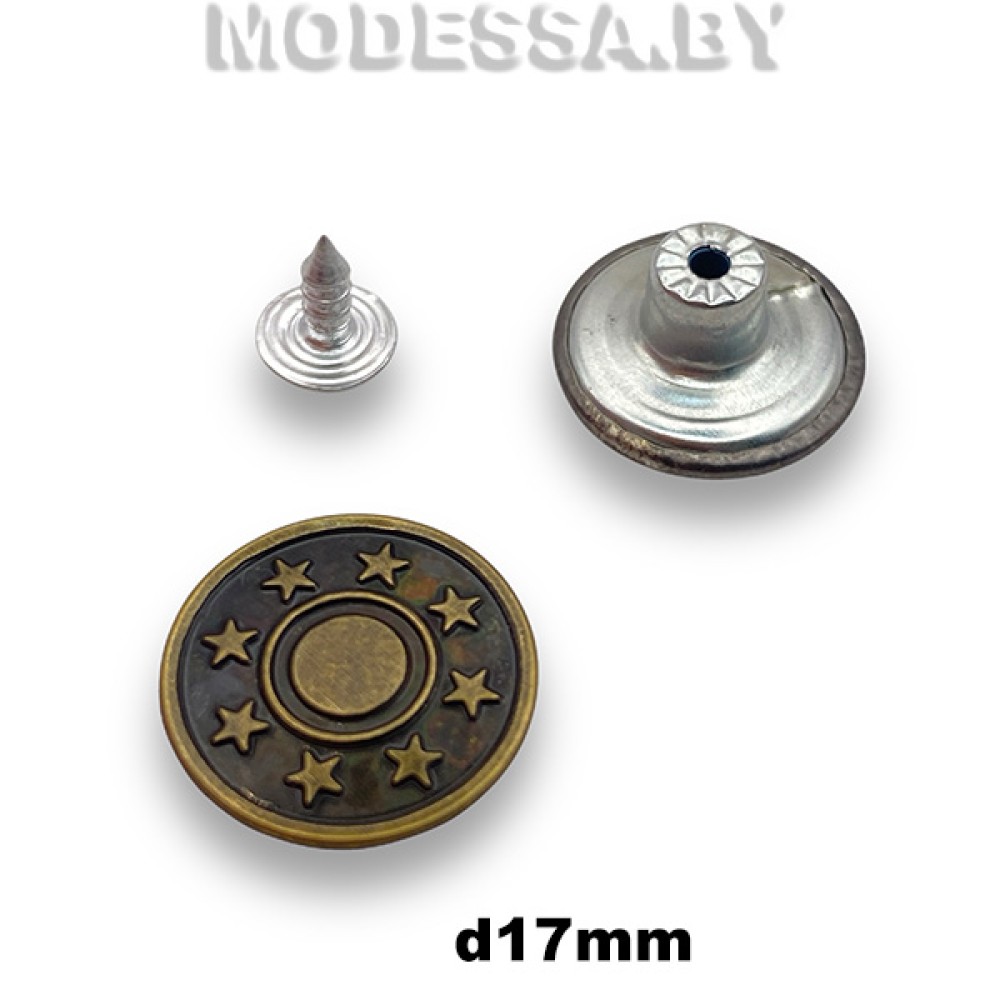 Заклёпка-пуговица металлическая, артикул: 27889.1, на фиксированной ножке. Диаметр 17мм. Джинсовые пуговицы используются при изготовлении одежды и других изделий из джинсовой ткани. Данная пуговица будет эффектно смотреться как на джинсовой одежде, так и на рюкзаке, сумке.