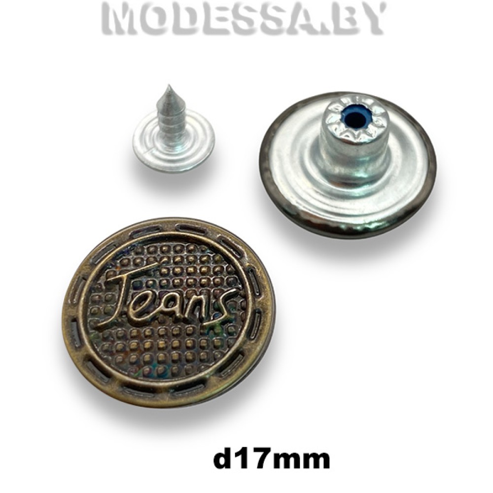 Заклёпка-пуговица металлическая, на фиксированной ножке, артикул: 27889.4. Диаметр 17мм. Джинсовые пуговицы используются при изготовлении одежды и других изделий из джинсовой ткани. Данная пуговица будет эффектно смотреться как на джинсовой одежде, так и на рюкзаке, сумке.