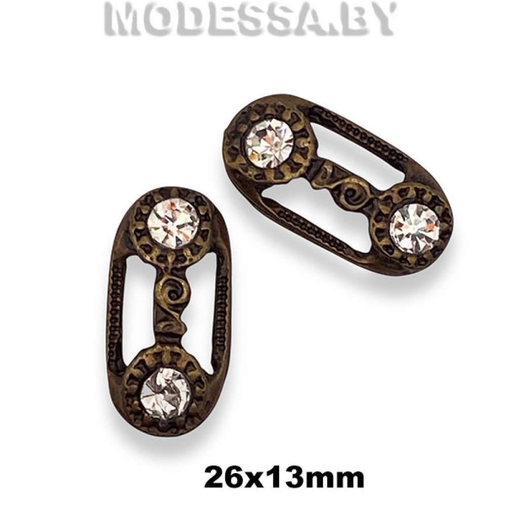 Украшение металлическое со стразами, артикул: 3042. Размер 26х13мм. Ширина отверстия для протяжки 10мм. Может применяться как декор для одежды, кожгалантерейных изделий, головных уборов, обуви, сумок и др.