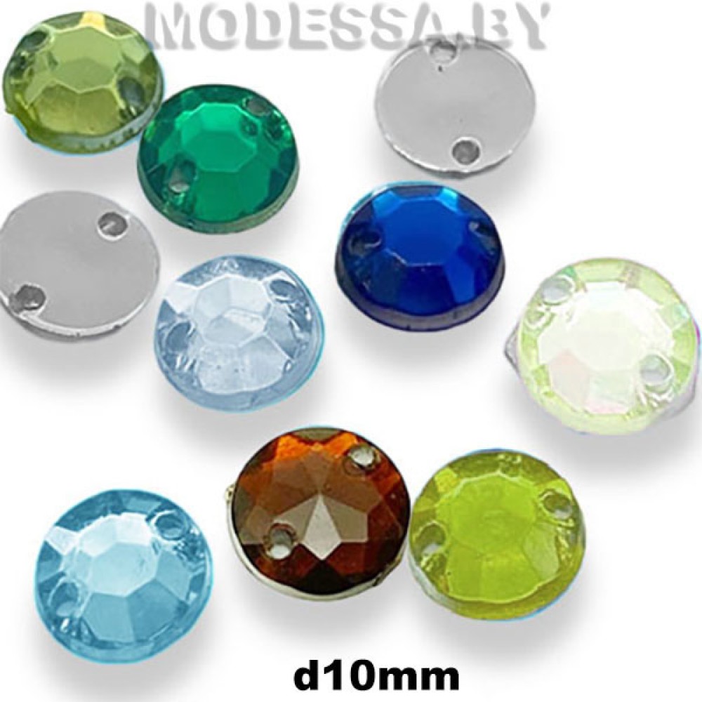 Украшение пластмассовое пришивное круглой формы. Диаметр 10мм. Украшение с двумя отверстиями и плоским дном используется для украшения одежды, обуви, сумок, для декорирования предметов интерьера, творческих поделок и др.