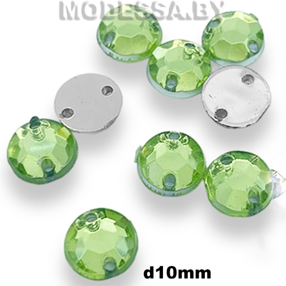 Украшение пластмассовое пришивное круглой формы. Диаметр 10мм. Украшение с двумя отверстиями и плоским дном используется для украшения одежды, обуви, сумок, для декорирования предметов интерьера, творческих поделок и др.