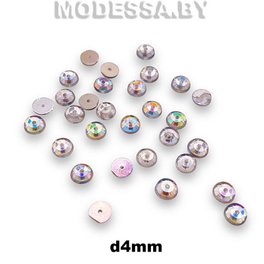 Украшение пластмассовое пришивное круглой формы. Диаметр 4мм. Украшение с одним отверстием и плоским дном используется для украшения одежды, обуви, сумок, для декорирования предметов интерьера, творческих поделок и др.
