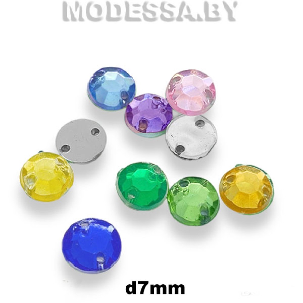Украшение пластмассовое пришивное круглой формы. Диаметр 7мм. Украшение с двумя отверстиями и плоским дном используется для украшения одежды, обуви, сумок, для декорирования предметов интерьера, творческих поделок и др.