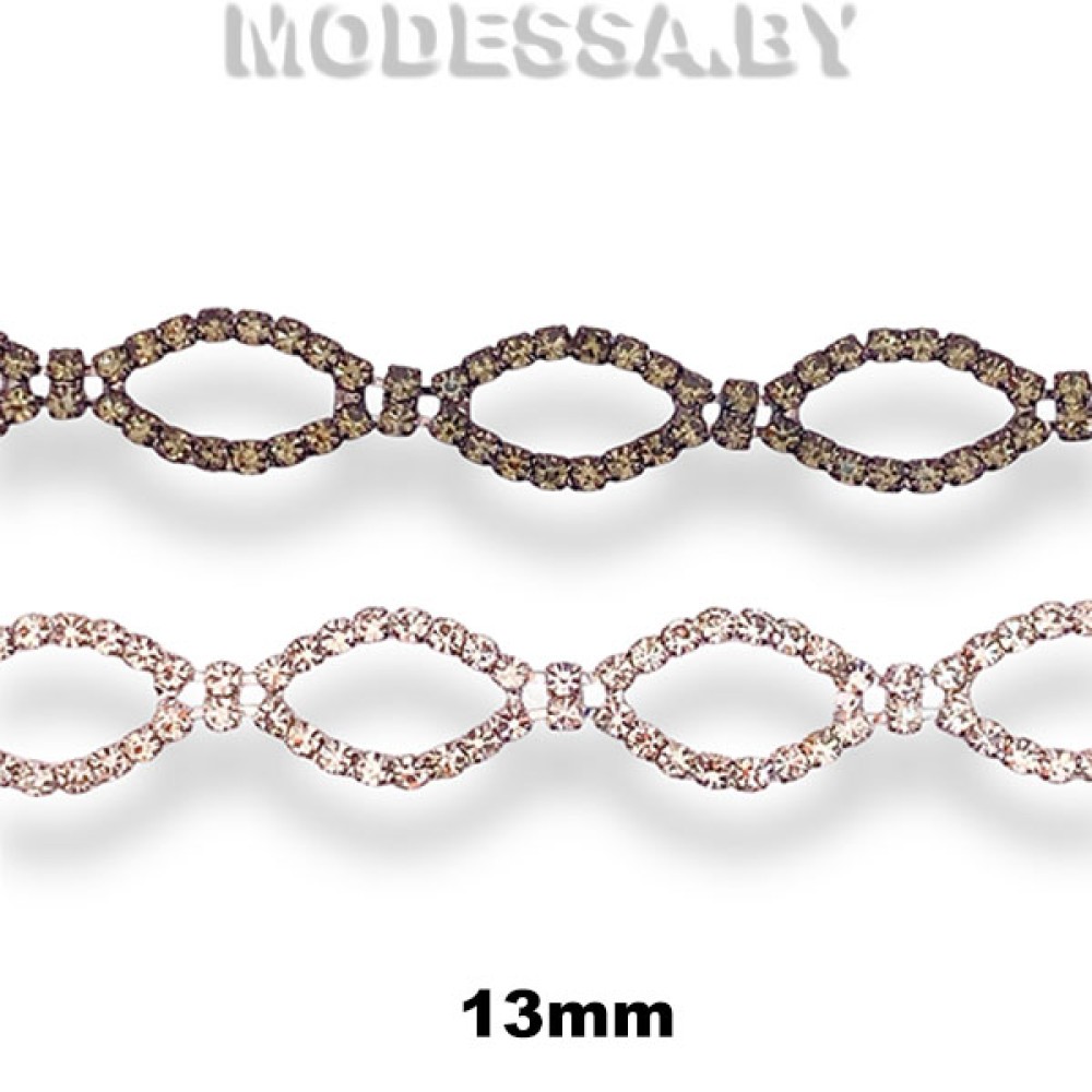 Цепочка из страз стеклянных в металлической оправе, артикул: 5821-DC. Ширина 13мм. Состоит из последовательно закрепленных страз в цапах, которые скреплены между собой подвижной металлической пластинкой. Стразовая цепочка применяется для создания уникальных женских украшений, браслетов, колье, сережек, чокеров; декорирования клатчей, сумочек, головных уборов, обуви и др.