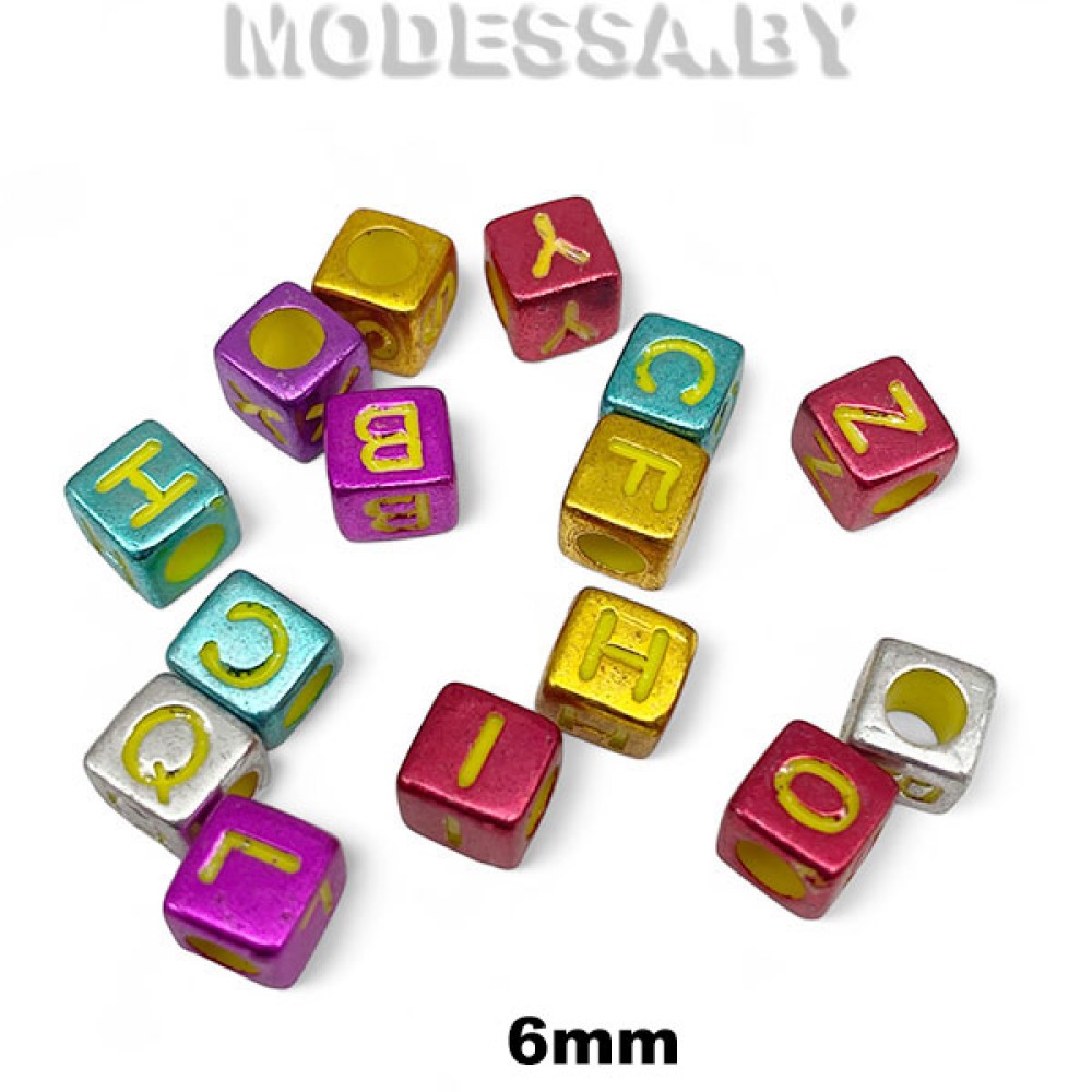 Бусины декоративные из пластмассы с нанесёнными английскими буквами, артикул: 489.009 AB, размер 6х6мм, внутренний диаметр 4мм. Используются для изготовления бус, браслетов, колье и другой бижутерии, аксессуаров, для декоративного украшения одежды и творческих поделок.