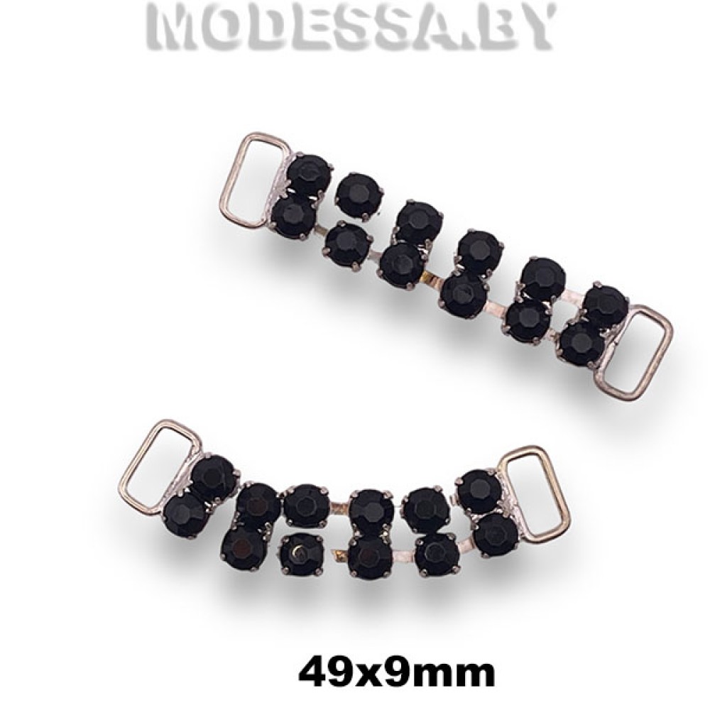 Пришивное украшение металлическое со стразами, артикул: 52 КС. Размер 49х9мм. Ширина отверстия для протяжки 7мм. Модель украшения идеально подходит для декорирования горловины блузок, рубашек или платьев, а также для декоративного оформления сумок, аксессуаров и др.