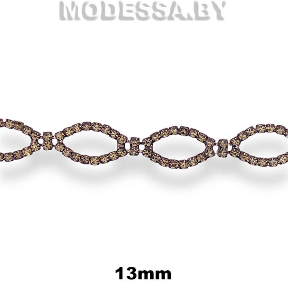 Цепочка из страз стеклянных в металлической оправе, артикул: 5821-DC. Ширина 13мм. Состоит из последовательно закрепленных страз в цапах, которые скреплены между собой подвижной металлической пластинкой. Стразовая цепочка применяется для создания уникальных женских украшений, браслетов, колье, сережек, чокеров; декорирования клатчей, сумочек, головных уборов, обуви и др.